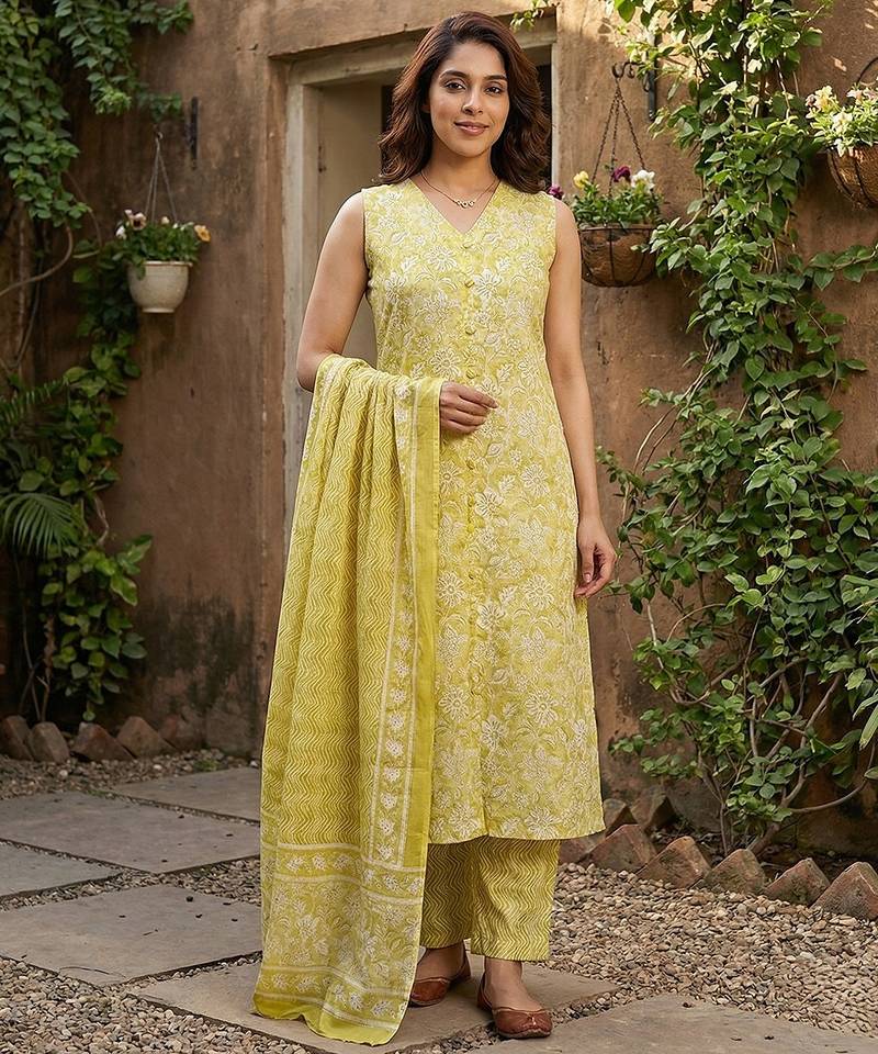• Product Id : 4723310 • Package Details : 1 Kurta /1 Trouser • Type : Kurta Sets • Work : Printed • Type : Floral Print • Sleeve : Sleeveless • Neck Style : V Neck • Color : Yellow • Fabric : Pure Cotton • Stitching : Stitched • Length : 46.0 Payments [+]