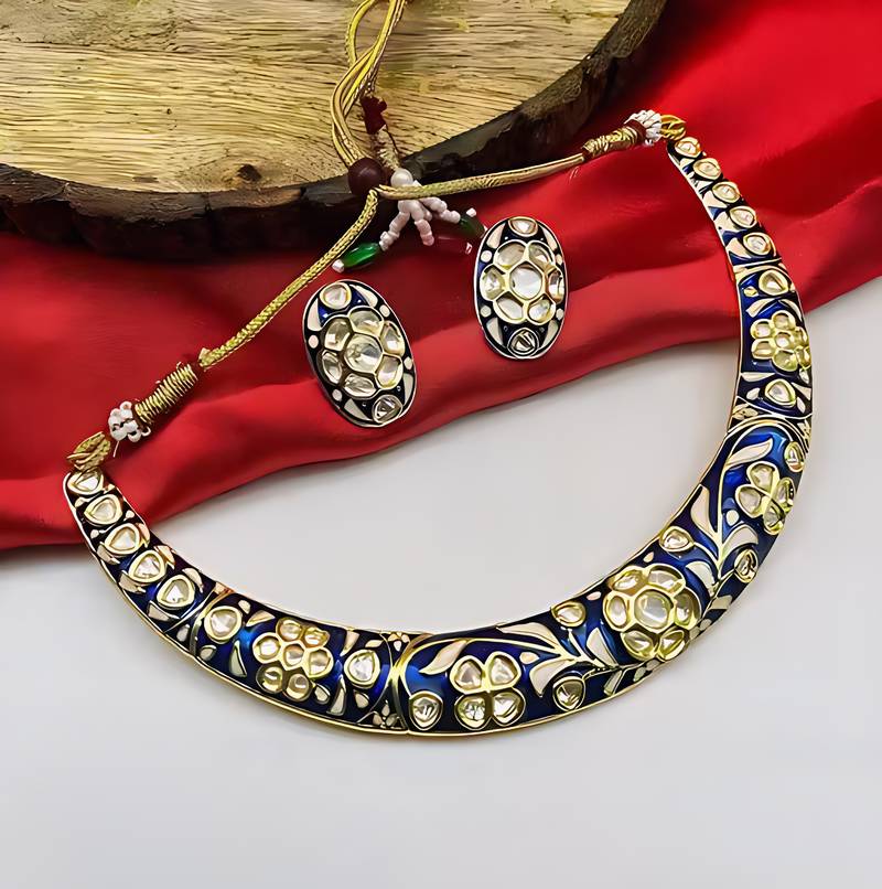 Elevate your style with this stunning Traditional Handcrafted Kundan Gold-Plated Necklace Set, a perfect blend of elegance, heritage, and timeless craftsmanship that stands out in any jewelry collection. Meticulously handcrafted by skilled artisans, this ethnic necklace set features a crescent-shaped design adorned with dazzling uncut Kundan stones, enriched with intricate floral motifs and finished in a luxurious gold-plated overlay. The bold blue detailing adds a regal touch, making it ideal for traditional Indian, Pakistani, and festive outfits worldwide.