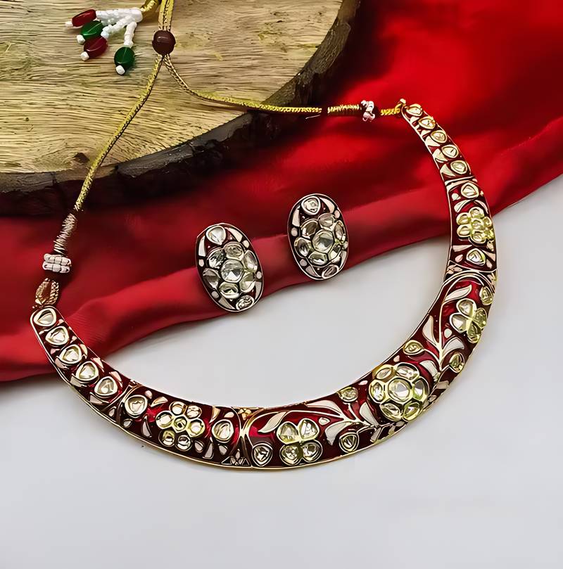 Elevate your style with this stunning Traditional Handcrafted Kundan Gold-Plated Necklace Set, a perfect blend of elegance, heritage, and timeless craftsmanship that stands out in any jewelry collection. Meticulously handcrafted by skilled artisans, this ethnic necklace set features a crescent-shaped design adorned with dazzling uncut Kundan stones, enriched with intricate floral motifs and finished in a luxurious gold-plated overlay. The bold red enamel detailing adds a regal touch, making it ideal for traditional Indian, Pakistani, and festive outfits worldwide.