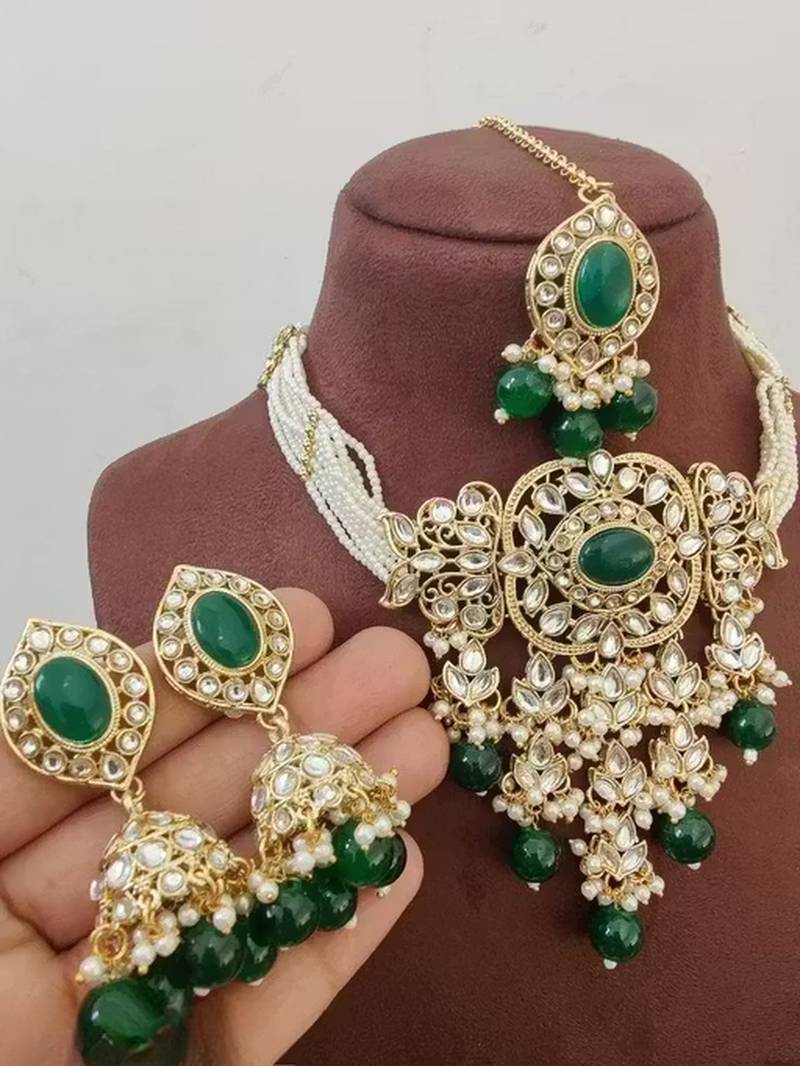 Elevate any traditional or Indo western look with this stunning gold plated green Kundan beaded necklace set, complete with matching jhumka style earrings and maangtikka for a full bridal or party wear ensemble. The rich white beads, white pearl clusters and intricate Kundan work create a luxurious handcrafted feel that instantly draws attention in wedding photos, festive celebrations and special occasions worldwide.