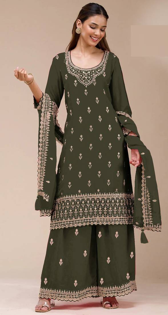 • Product Id : 4679698 • Package Details : 1 Top / 1 Dupatta / 1 Bottom • Type : Palazzo Suits • Region : Indian • Occasion : Wedding • Work : Embroidered • Type : Zari Work • Look : Fashion • Sleeve : Full Sleeve • Neck Style : Round Neck • Stitching : Semi Stitched • Fabric : Georgette • Color : Green • Min Bustsize Fit : 36.0 • Max Bustsize Fit : 48.0 Stitching [+]