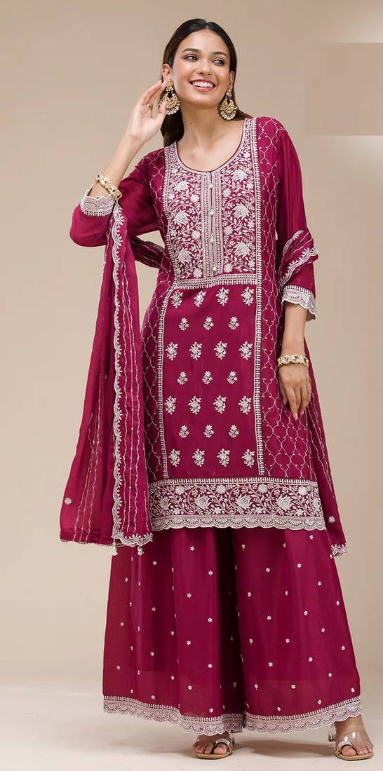 Rani Pink Colored Palazzo Style Salwar Suit is prettified with Embroidery work,Zari And Sequence Work as shown which makes it appear classy. This top is made of Georgette fabric which is accompanied with Georgette Bottom,Santoon Inner and Georgette dupatta. Women can buy this suit to wear for their parties and functions.