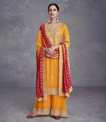 Make an everlasting ethnic statement with this mustard yellow sharara suit, crafted for elegance and comfort. The contemporary embroidery and vibrant contrast of the red Bandhani dupatta make this sharara set a standout choice for festive and wedding occasions.