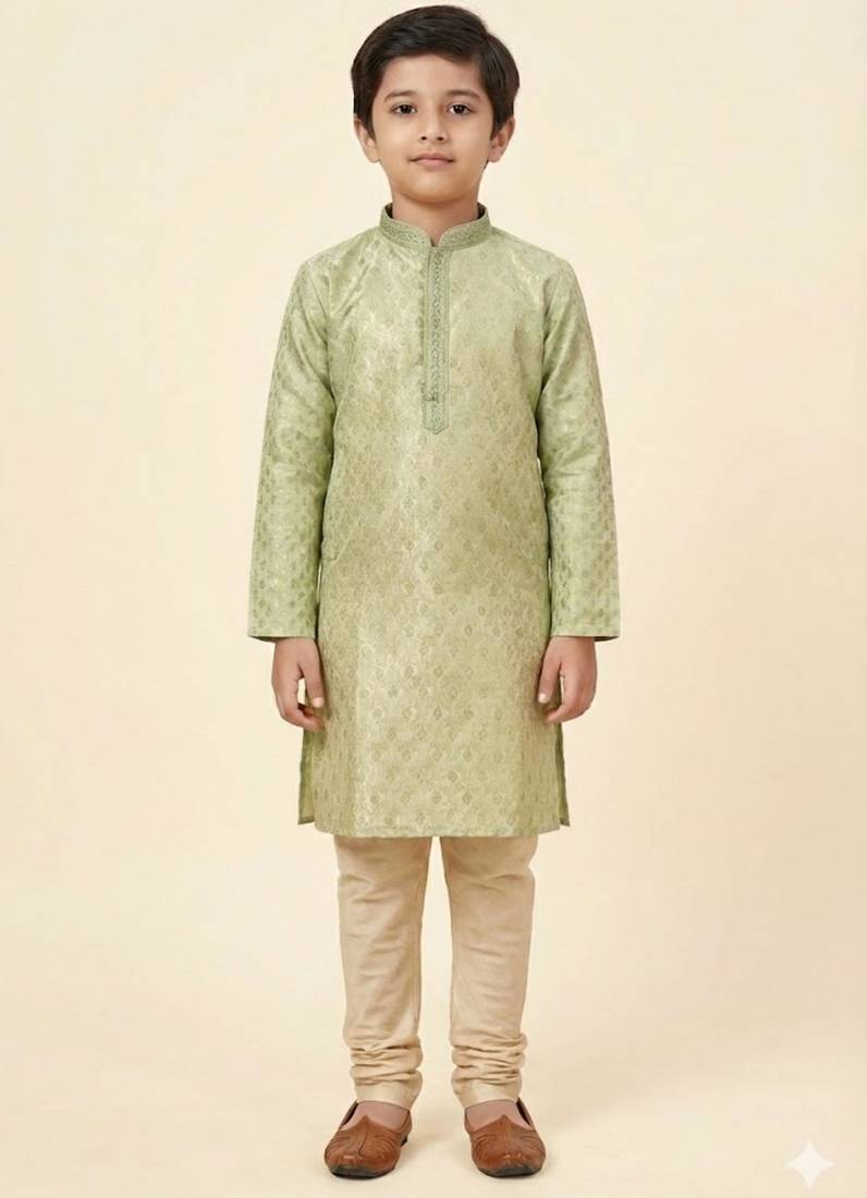 Green Printed Poly Jacquard Kurta Pajama For Kids
