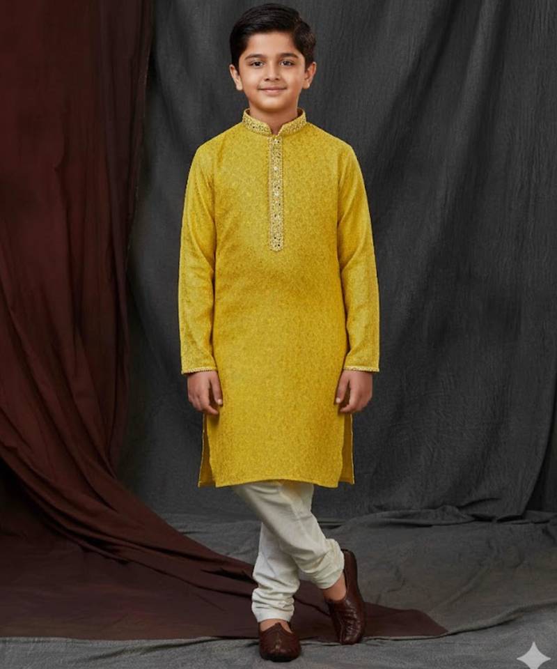 Yellow Jacquard Printed Kurta Pajama For Boys
