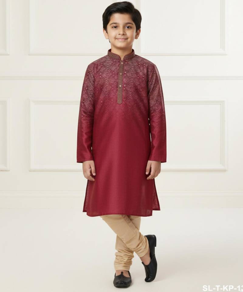 Maroon Art Silk Printed Kurta Pyjama For Boys