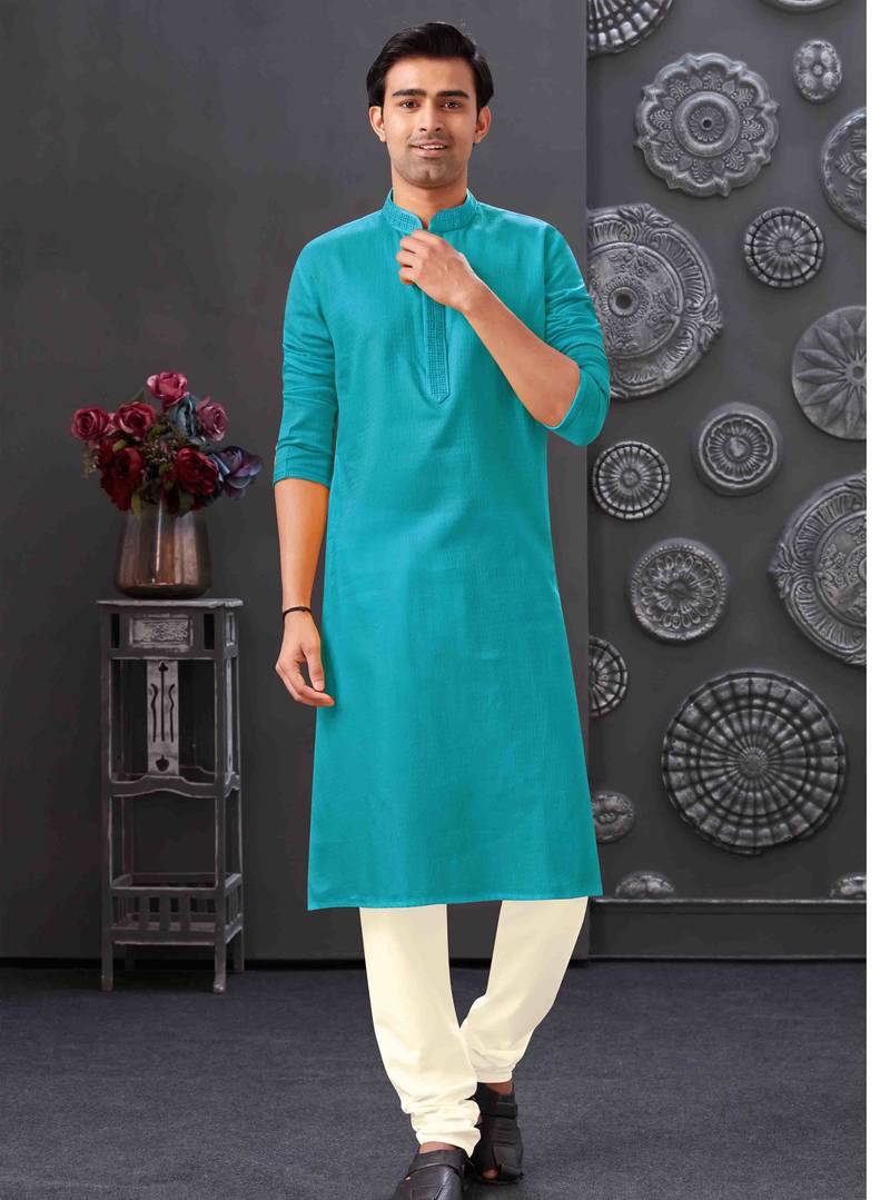 Men's Poly Cotton Straight Firozi Kurta Set