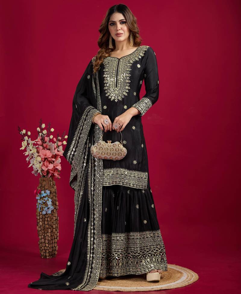 • Product Id : 4702752 • Package Details : 1 Kurta/ 1 Sharara • Type : Kurta Sets • Fabric : Silk • Work : Embroidered • Type : Sequins Work • Sleeve : Full Sleeve • Color : Black • Stitching : Stitched • Length : 39.0 Payments [+]