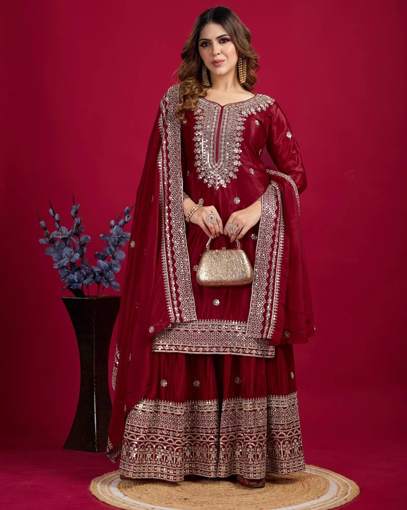 • Product Id : 4702753 • Package Details : 1 Kurta/ 1 Sharara • Type : Kurta Sets • Fabric : Silk • Work : Embroidered • Type : Sequins Work • Sleeve : Full Sleeve • Color : Maroon • Stitching : Stitched • Length : 39.0 Payments [+]