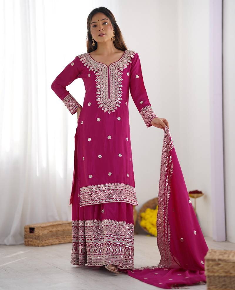 • Product Id : 4702749 • Package Details : 1 Kurta/ 1 Sharara • Type : Kurta Sets • Fabric : Silk • Work : Embroidered • Type : Sequins Work • Sleeve : Full Sleeve • Color : Pink • Stitching : Stitched • Length : 39.0 Payments [+]