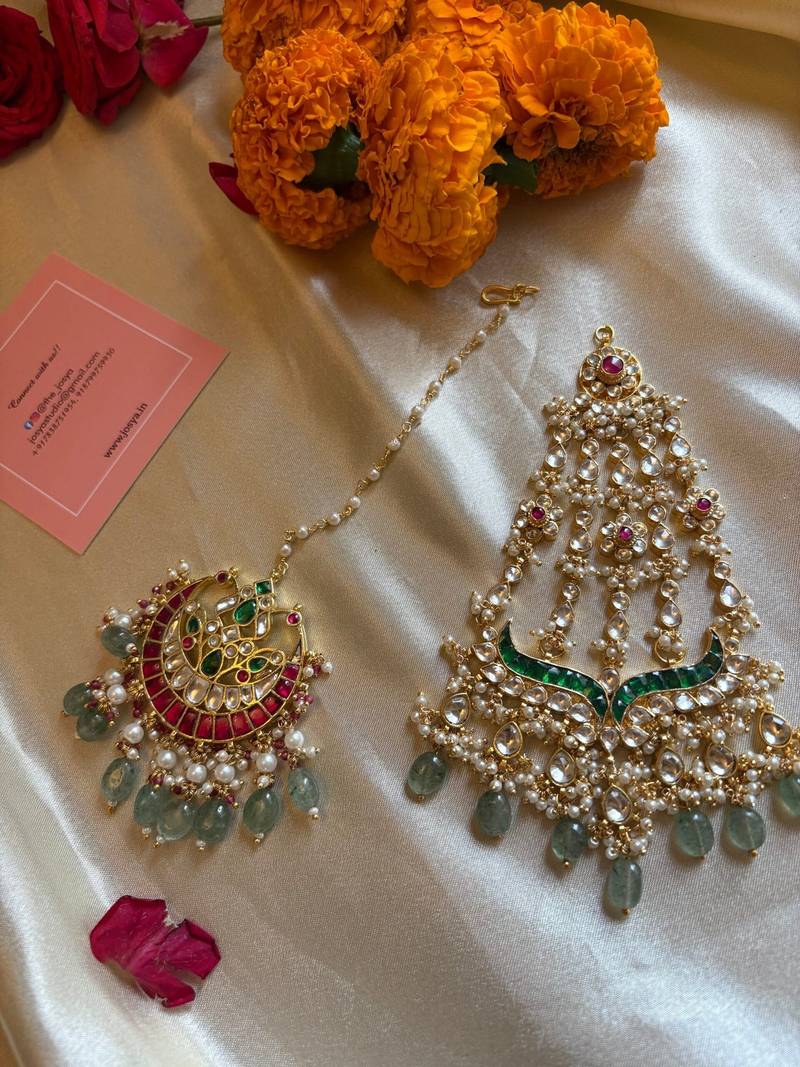 If you find the product for less we'll match it! Know MoreThis exquisite luxurious Gold-Plated Emerald and Kundan Jadau Passa with Maang Tikka is a stunning piece of jewelry that will elevate any bridal or festive look. It features a beautiful combination of emeralds, pink and white Kundan, and mint green beads and pearls, creating a look of timeless elegance. The intricate Jadau work and delicate design make this set a true masterpiece. The Medium size Passa and Maang Tikka can be worn together for a complete bridal look, or separately for a more versatile style.