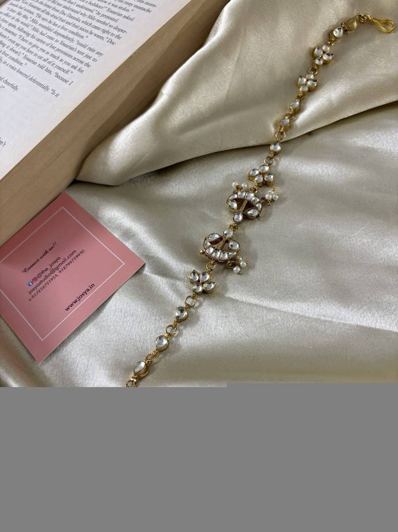If you find the product for less we'll match it! Know MoreExperience the allure of traditional craftsmanship with this meticulously handcrafted Kundan Mathapatti. Each Kundan stone is intricately set, radiating a captivating sparkle. Delicate chand motifs enhance its timeless appeal, while dangling pearl accents sway gracefully, adding a touch of feminine charm. This Mathapatti is a true statement piece, perfect for brides or anyone seeking to infuse their ensemble with regal elegance.