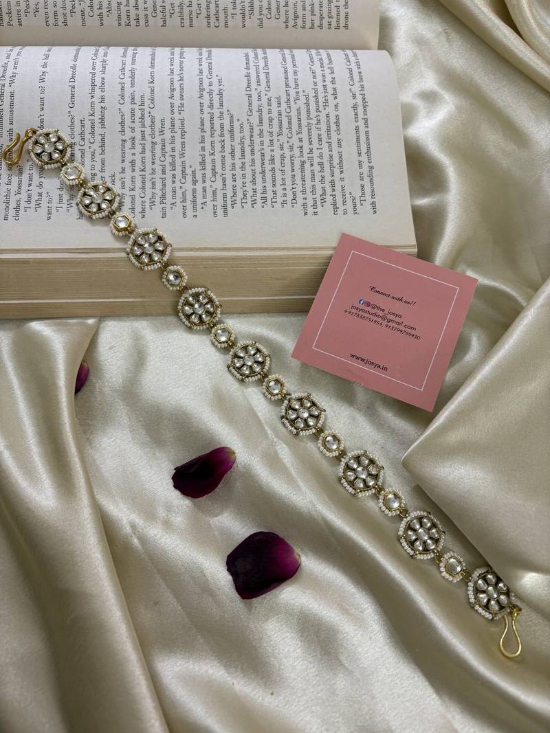 If you find the product for less we'll match it! Know MoreExperience the allure of traditional craftsmanship with this meticulously handcrafted Kundan Mathapatti. Each Kundan stone is intricately set, radiating a captivating sparkle. Delicate round motifs enhance its timeless appeal, while dangling pearl accents sway gracefully, adding a touch of feminine charm. A true statement piece, this Mathapatti is perfect for brides or anyone looking to infuse their ensemble with regal elegance.