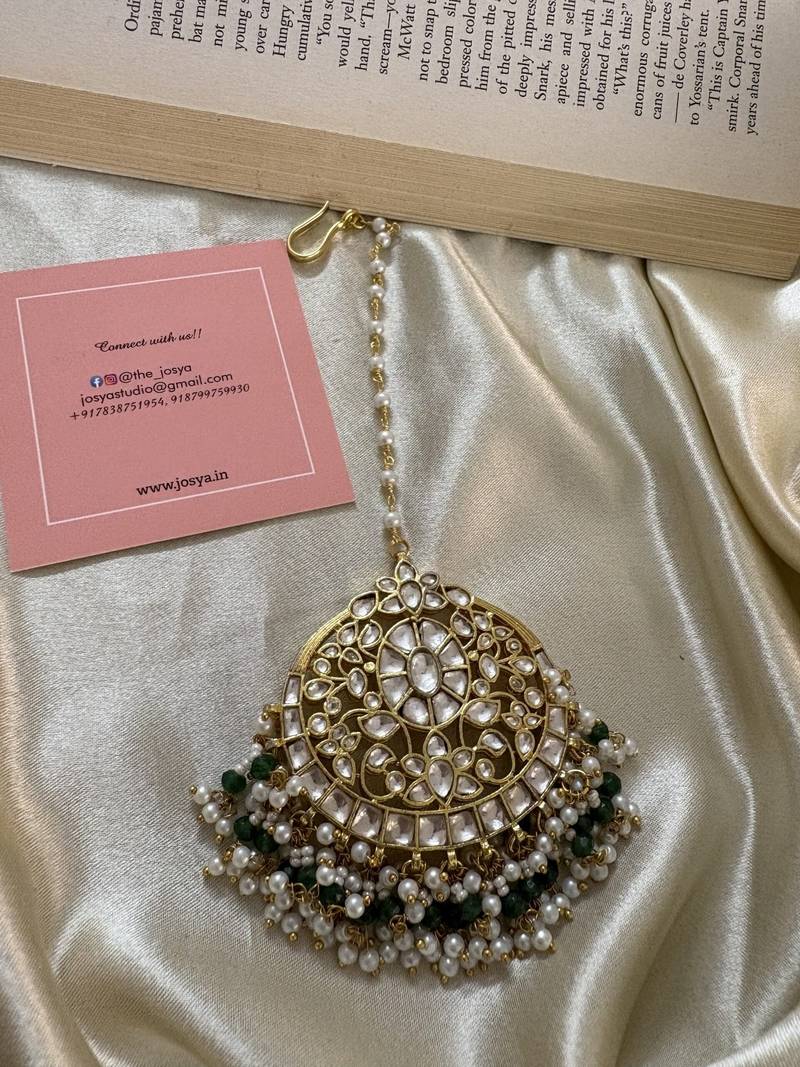 If you find the product for less we'll match it! Know MoreIntroducing the bigsize Ruchita Maangtikka, a perfect choice for Haldi or Mehendi ceremonies. Adorned with Pachi Kundan stones, green beads, and off-white pearl bunches drops, this exquisite piece is finished with a luxurious micron gold polish for a regal touch.