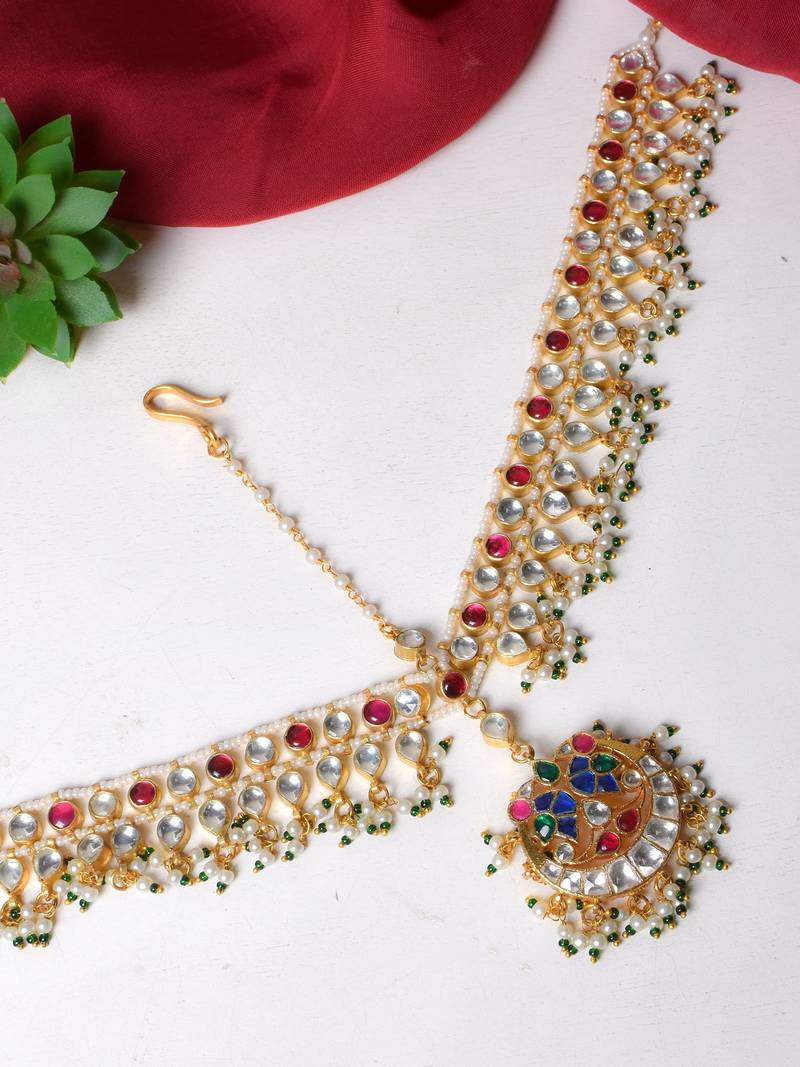 If you find the product for less we'll match it! Know MoreThis statement mathapatti, handcrafted with multi color pachi kundan and accented with pearls exudes an elegant and timeless charm. The blend of delicate pearls & green small beads creates the perfect accessory for a bride who wants to make a regal impression.
