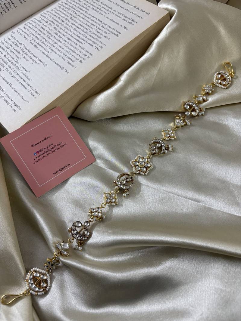 If you find the product for less we'll match it! Know MoreExperience the allure of traditional craftsmanship with this meticulously handcrafted Kundan Mathapatti. Each Kundan stone is intricately set, radiating a captivating sparkle. Delicate chand motifs enhance its timeless appeal, while dangling pearl accents sway gracefully, adding a touch of feminine charm. This Mathapatti is a true statement piece, perfect for brides or anyone seeking to infuse their ensemble with regal elegance.
