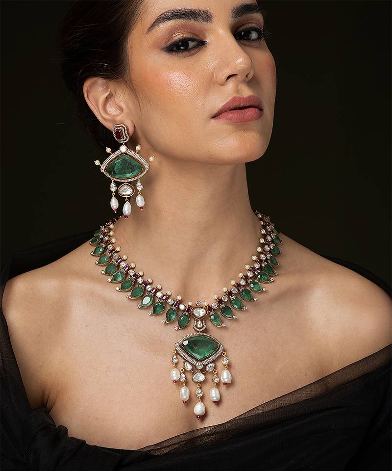 A Stunning Necklace Set Composed Of Deep Green, Rectangular-Cut Stones Bordered By Small Ruby-Toned Beads, Finished With A Grand Matching Pendant. This Royal Set Makes An Unforgettable Luxury Gift.
