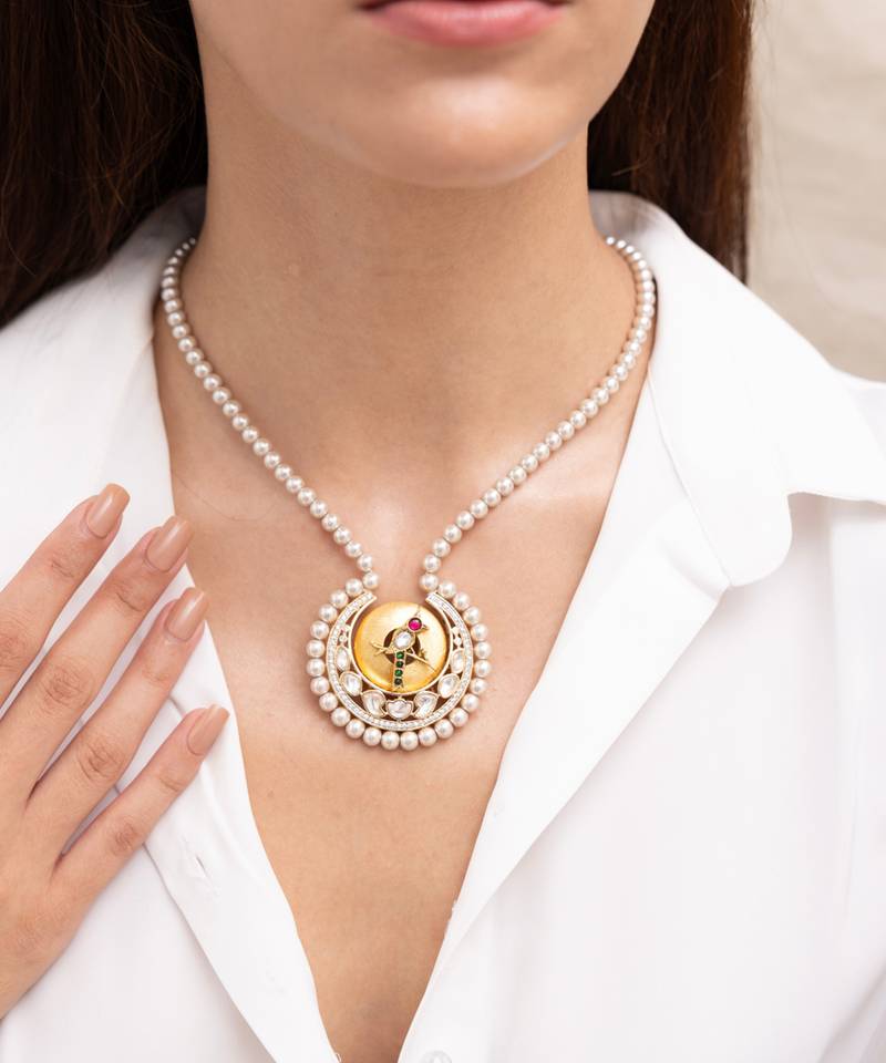 This Necklace Features A Royal Crescent Motif Flanked By Kundan And Crystal Accents, Suspended On A Dainty Chain. A Graceful Blend Of Tradition And Modern Finesse—Perfect For Both Intimate Ceremonies And Elegant Dinners.