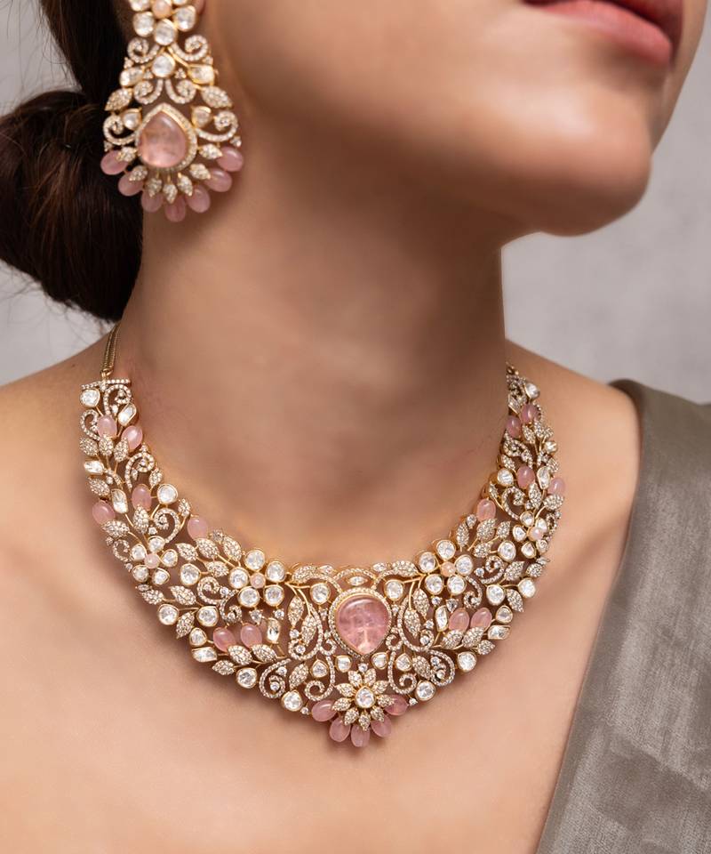 Crafted In Blush Pink Tones And Intricate Crystal Layering, This Necklace And Earring Set Exudes Feminine Sophistication. A Lovely Choice For Pre-Wedding Functions Like Sangeet Or Engagement Celebrations.