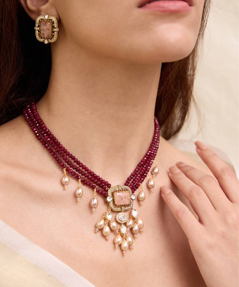 This Maroon-Beaded Necklace Set Comes With Matching Earrings And A Dramatic Floral Pendant Embellished With Kundan And Pearls. A Vibrant, Regal Ensemble Ideal For Festive Occasions And Ethnic Celebrations.