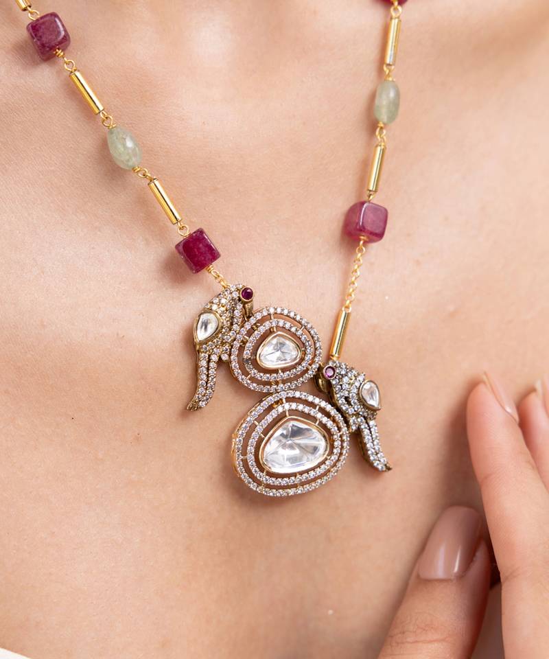 A Vibrant Necklace Featuring Multicolored Beads Interspersed With Kundan Work And An Ornate Pendant. Full Of Youthful Flair And Bird Motif Artistry, It Feels Like A Celebration In Every Strand. Ideal For Haldi, Mehendi, Or Boho-Themed Ceremonies.