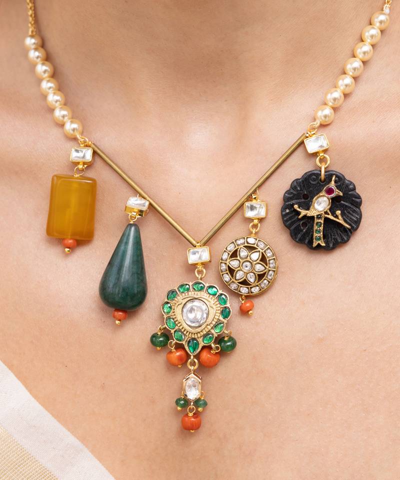 An Artful Composition Of Miniature Charms, This Statement Necklace Brings Together Florals, Domes, Tassels, And Mirror Work In A Vibrant, Eclectic Arrangement. Its Layered Storytelling Makes It Perfect For Curated Festive Looks Or Bohemian Celebrations.