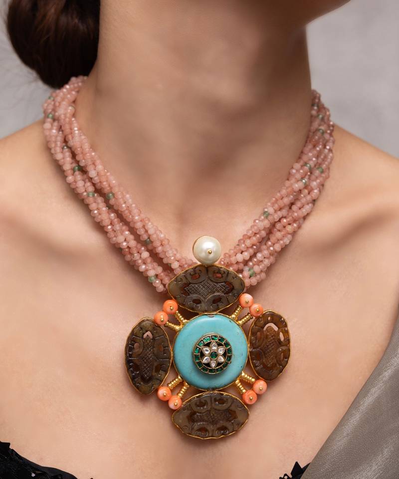 A Vibrant Masterpiece Combining Pink Strands With A Large Floral Pendant In Blue And Green Enamel, Accented By Pearls. Artistic And Bold, This Set Is Perfect For Haldi, Mehendi, Or A Standout Festive Ensemble.