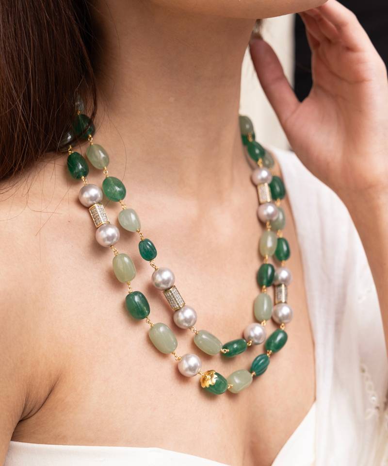 A Fusion Of Classic Pearls And Soft Green Gemstones, This Layered Necklace Evokes Freshness With A Hint Of Nostalgia. A Versatile Beauty That Complements Both Heritage Looks And Breezy Modern Outfits.