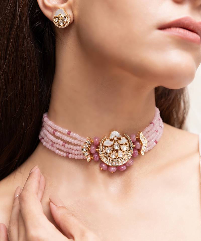 A Blush-Toned Choker That Combines Rosy Beaded Strands With A Radiant Central Kundan Floral Pendant. Feminine And Festive, It's Perfect For Mehendi, Sangeet, Or Pastel-Themed Celebrations.