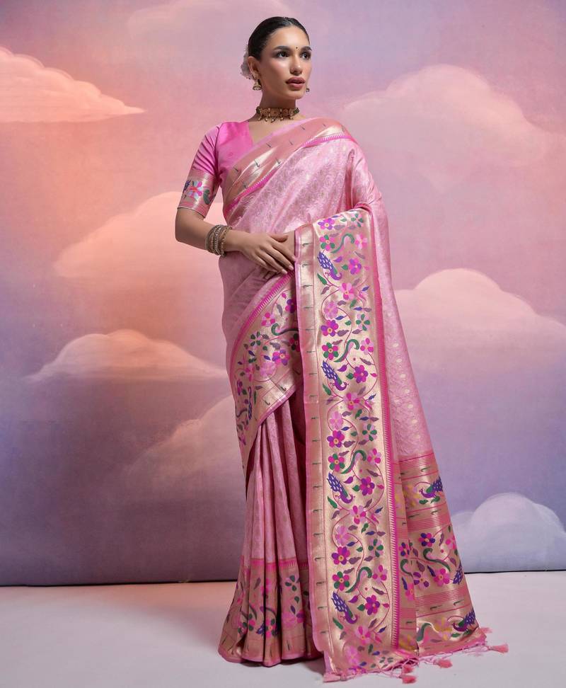 Baby Pink Paithani Silk Zari Woven Saree With Blouse