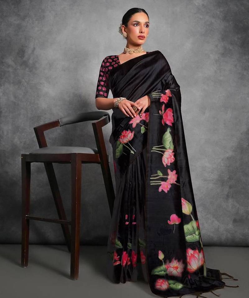 Black Soft Tussar Silk Floral Printed Saree With Blouse