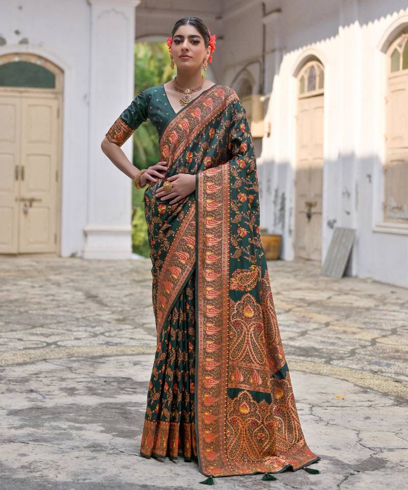 • Border : Designer Border • Color : Dark Green • Fabric Of : Pashimina Silk • Color : Dark Green Blouse Details