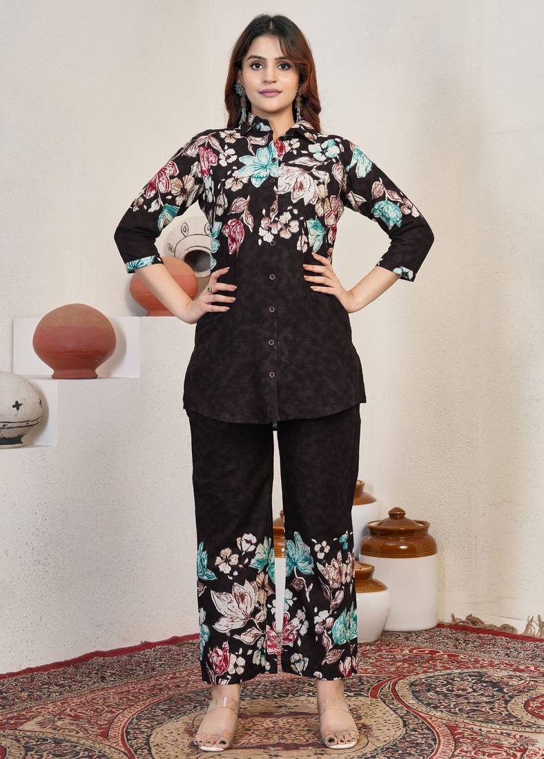 • Product Id : 4755024 • Package Details : 1 Top/1 Bottom • Type : Co Ord Sets • Fabric : Cotton • Work : Printed • Type : Floral Print • Sleeve : Half Sleeve • Neck Style : V Neck • Color : Coffee • Stitching : Stitched • Occasion : Ethnic • Style : Classic • Length : Midi • Length : Midi General - Color and Texture may have slight variation. This happens because of photography.