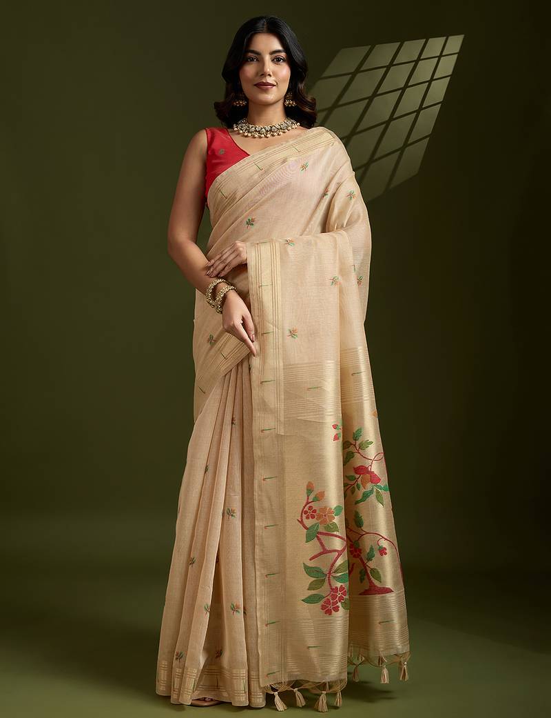 Cream Soft Muga Cotton Paithani Zari Woven Saree With Blouse