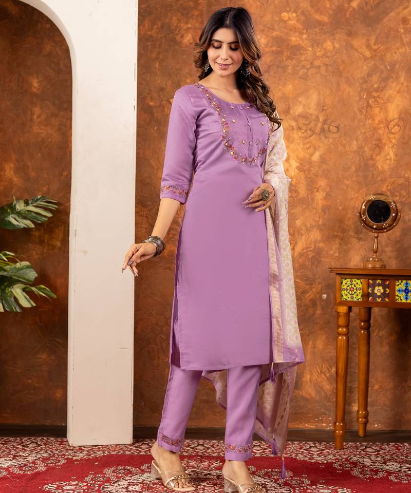 • Product Id : 4709390 • Package Details : 1 Top/1 Bottom/1 Dupatta • Type : Readymade Suits For Women • Region : India • Type : Hand Embroidery • Look : Traditional • Sleeve : Half Sleeve • Neck Style : Round Neck • Fabric : Silk • Color : Lavender • Work : Thread Embroidery • Stitching : Stitched Payments [+]