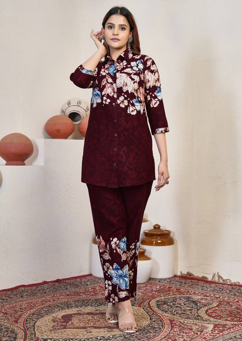 • Product Id : 4755027 • Package Details : 1 Top/1 Bottom • Type : Co Ord Sets • Fabric : Cotton • Work : Printed • Type : Floral Print • Sleeve : Half Sleeve • Neck Style : V Neck • Color : Maroon • Stitching : Stitched • Occasion : Ethnic • Style : Classic • Length : Midi • Length : Midi General - Color and Texture may have slight variation. This happens because of photography.