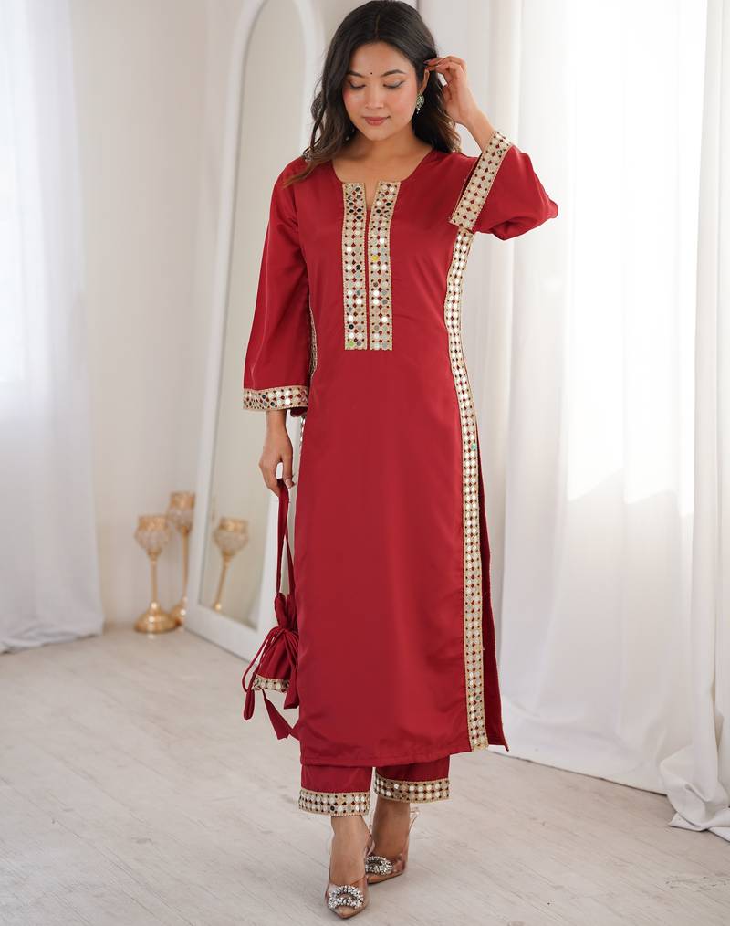Maroon Real Mirror Viscose Designer Kurta Set With Batwa Stitched