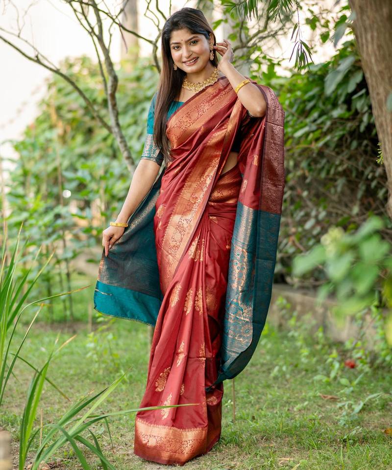 • Saree : Color- Maroon / Fabric- Banarasi Silk • Blouse : Color- Teal / Fabric- Banarasi Silk Saree Details