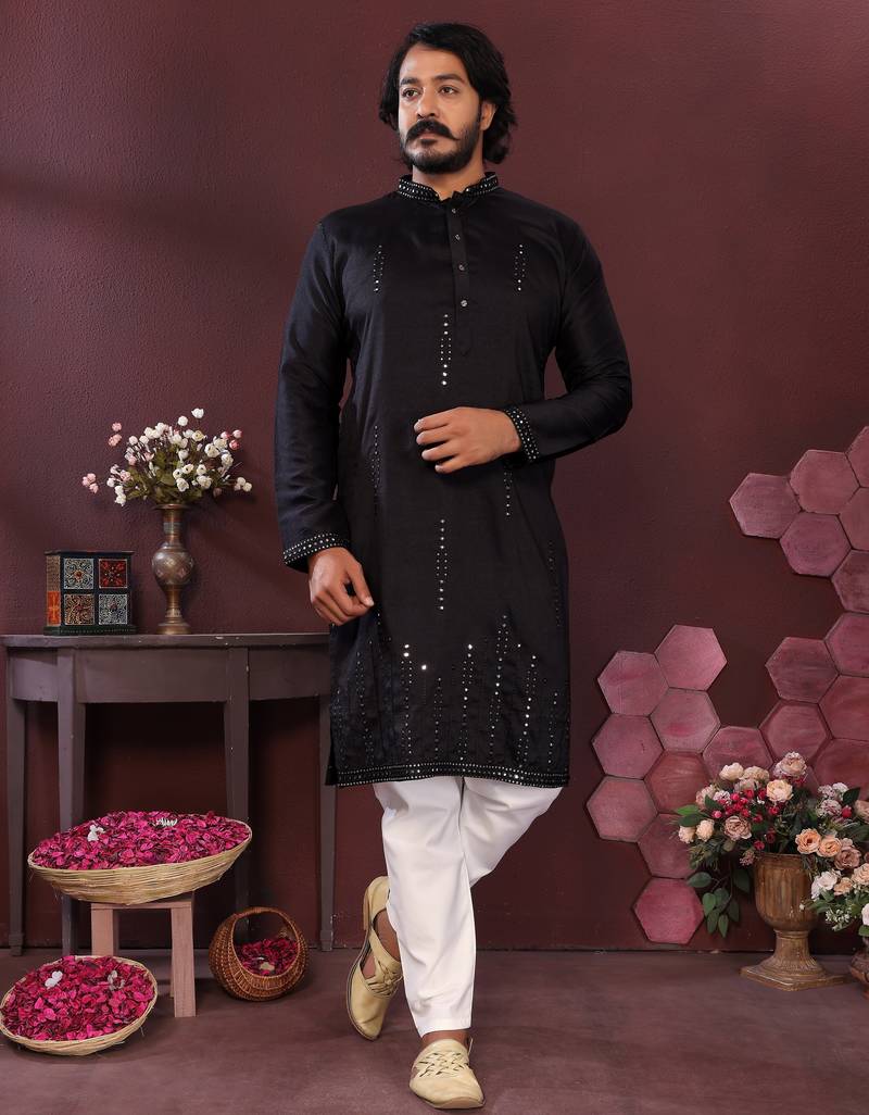 Men's Black Silk Mirror Embroidered Kurta With Pajama Set