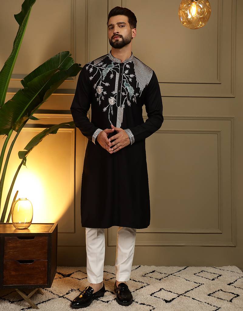 Men's Black Viscose Silk Sequins Embroidered Kurta With Pajama Set