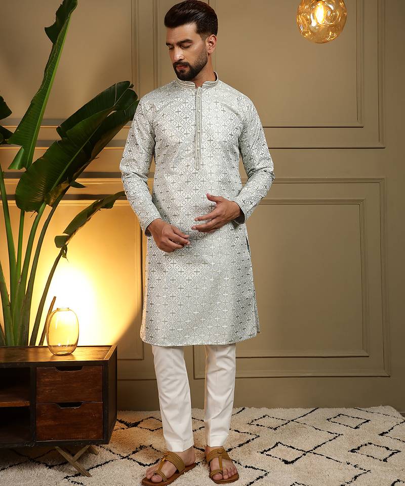 Men's Mehendi Jacquard Woven Kurta With Pajama Set