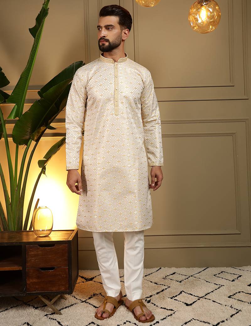 Men's Mustard Jacquard Woven Kurta With Pajama Set