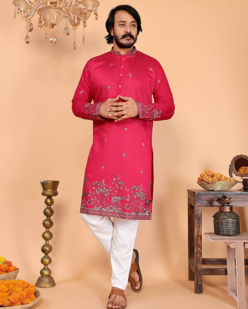 Men's Pink Linen Cotton Sequins Embroidered Kurta With Pajama Set