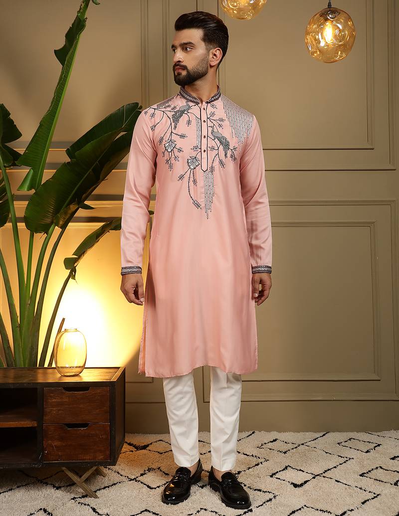 Men's Pink Viscose Silk Sequins Embroidered Kurta With Pajama Set