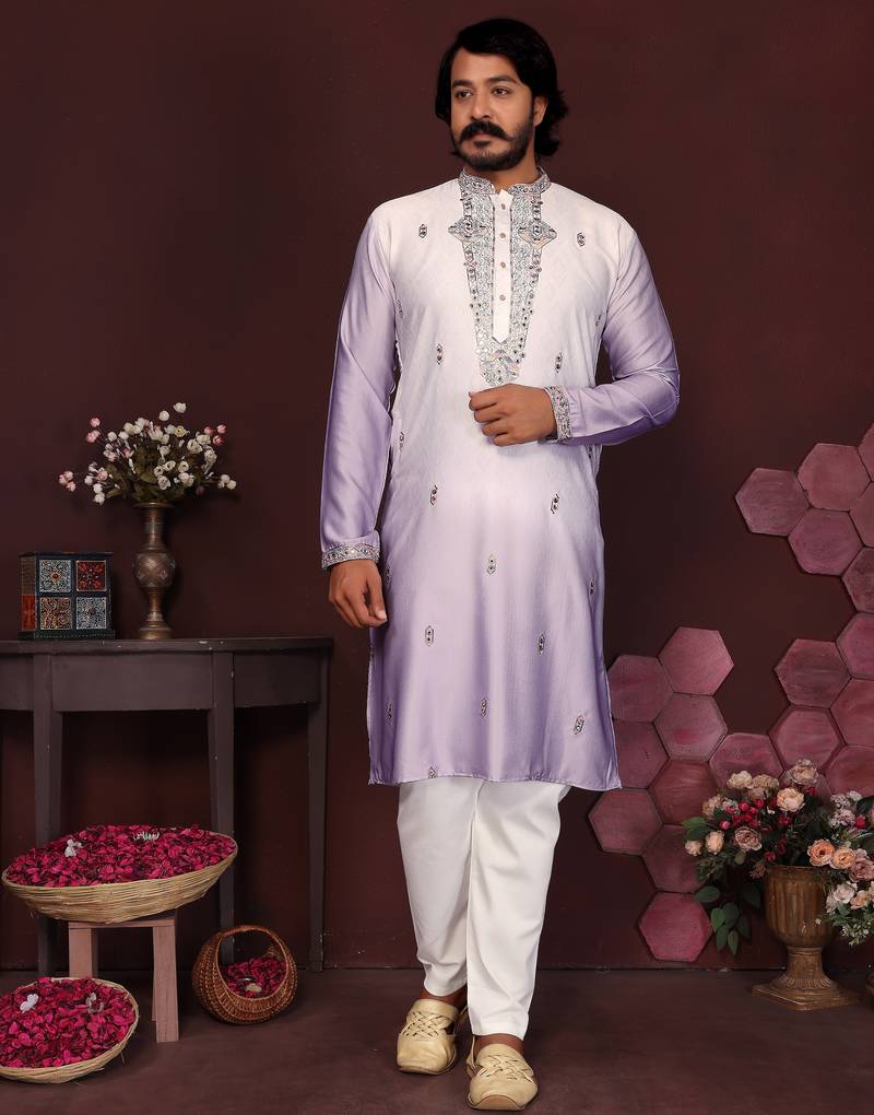 Men's Purple Cotton Silk Sequins Embroidered Kurta With Pajama Set