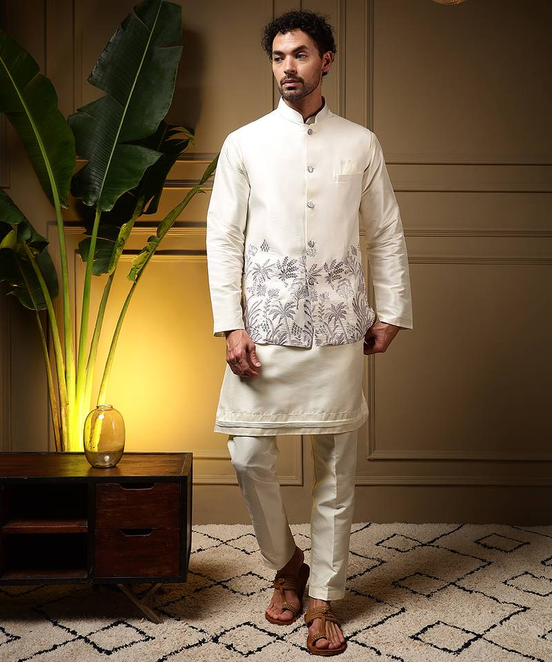 • Work: Sequins EmbroideredPackage Contains: 1 Kurta, 1 Bottom, 1 Nehru Jacket