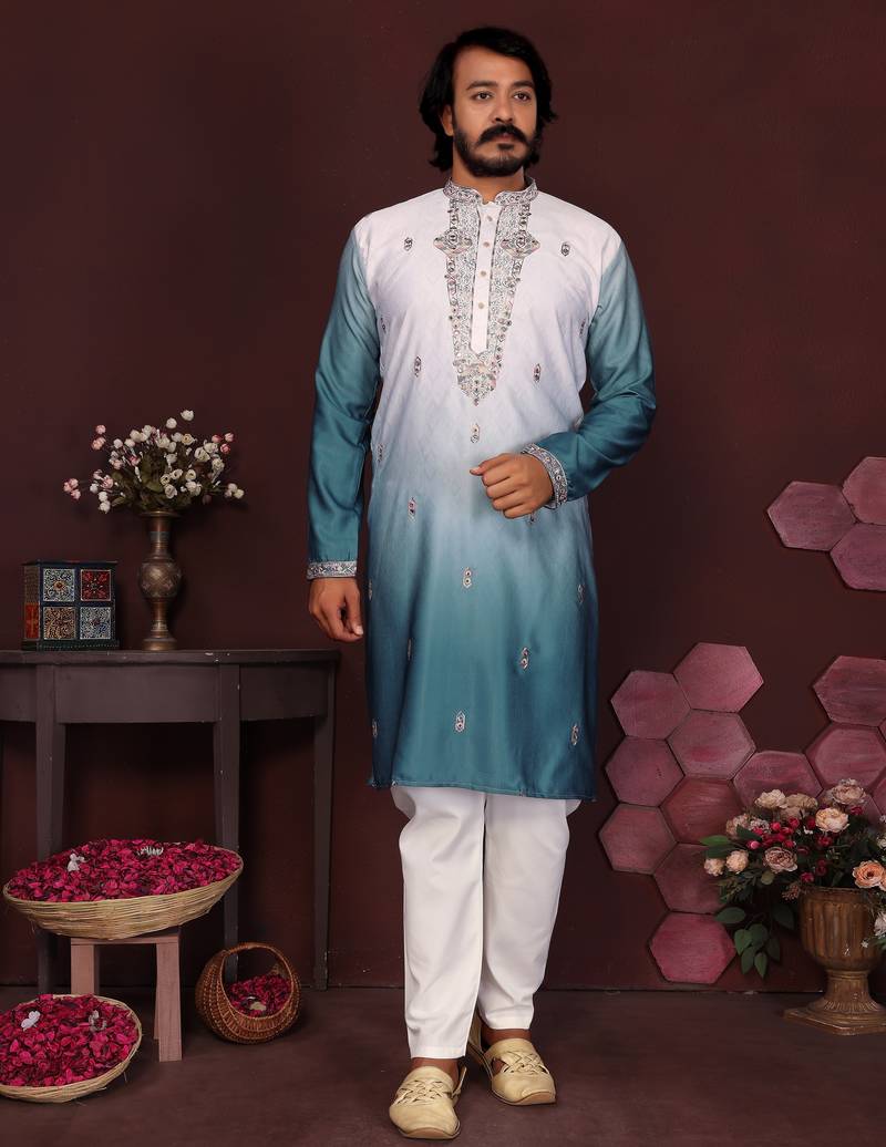 Men's Teal Cotton Silk Sequins Embroidered Kurta With Pajama Set