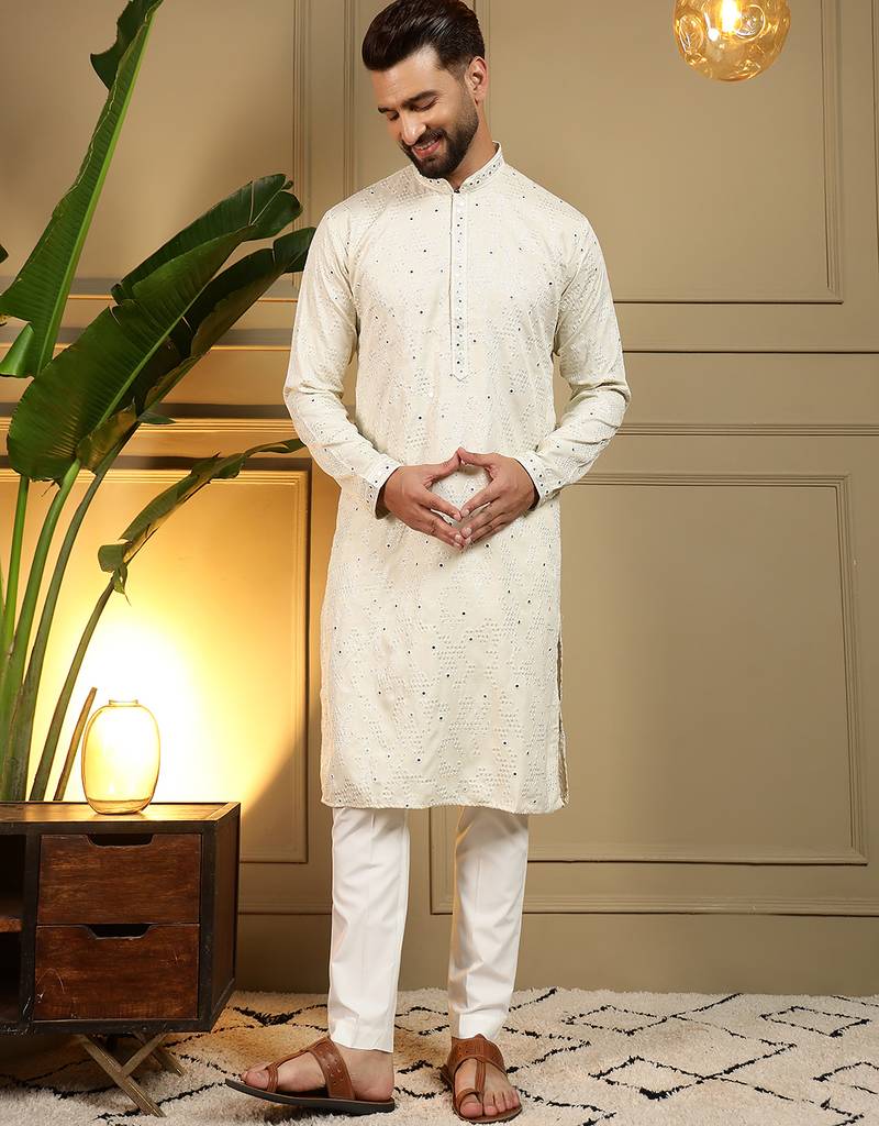 Men's White Khadi Cotton Mirror Embroidered Kurta With Pajama Set