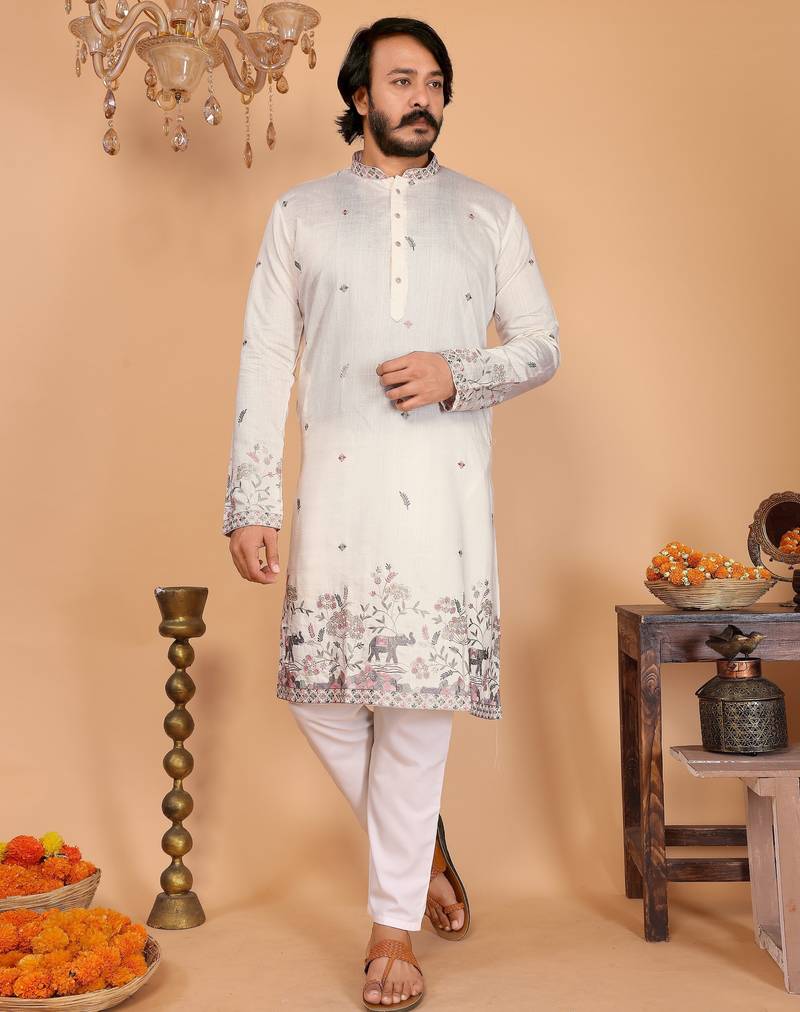 Men's White Linen Cotton Sequins Embroidered Kurta With Pajama Set
