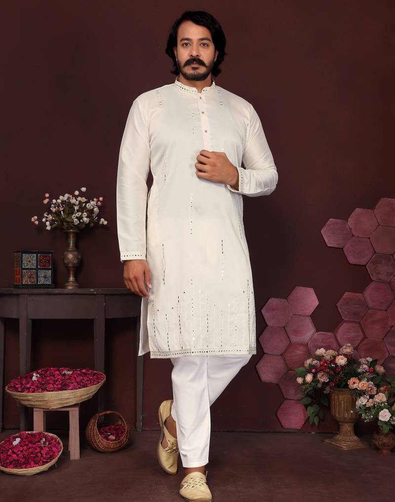 Men's White Silk Mirror Embroidered Kurta With Pajama Set